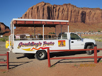 We climbed aboard the Goulding Tour vehicle, and headed out to view Monument Valley with our Native guide. Before long he had the tourists speaking Navajo, and shouting at the numerous tours passing by us. We passed through the entry booths, (remember....Navajo Reservation) but the tour cost obviously included the cost of admission, and we breezed past the lines of cars awaiting entry. We soon made a right turn and headed down a red dirt road leading into the Valley.