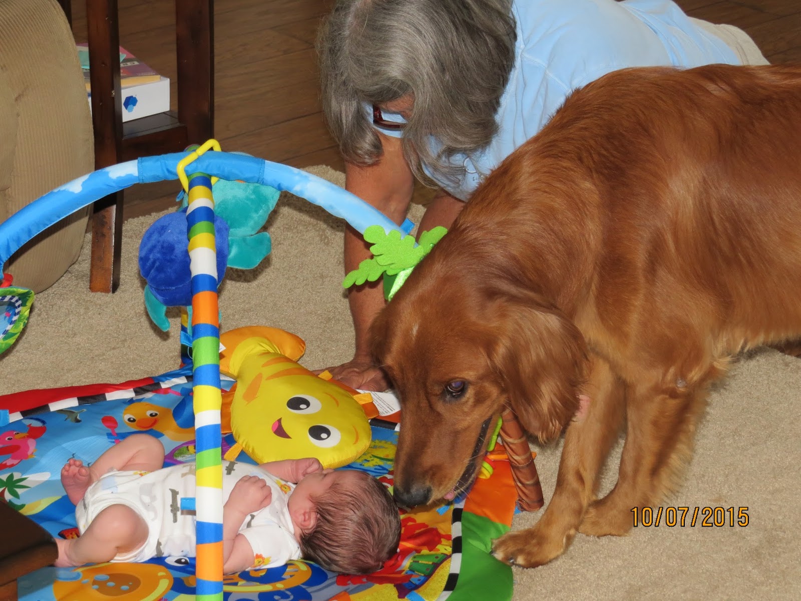 As the new family rested comfortably at the hospital enjoying gourmet meals, the grandparents (mostly Debbie) were busy entertaining Jamo. He has a ton of high energy, but Debbie seems to enjoy pestering the daylights out of him. He'll run back and forth all day it seems, if someone will throw anything, and at the end of the day, Debbie is pretty pooped!